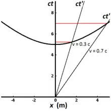 Fig. 2-8 illustrates the invariant hyperbola for all events that can be reached from the origin in a proper time of 5 meters (approximately 1.67×10−8 s). Different world lines represent clocks moving at different speeds. A clock that is stationary with respect to the observer has a world line that is vertical, and the elapsed time measured by the observer is the same as the proper time. For a clock traveling at 0.3 c, the elapsed time measured by the observer is 5.24 meters (1.75×10−8 s), while for a clock traveling at 0.7 c, the elapsed time measured by the observer is 7.00 meters (2.34×10−8 s).[3]: 220–221