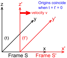 - The origins of frames S and S′ are coincident when time t = 0 for frame S and t′ = 0 for frame S′.[6]: 107