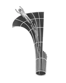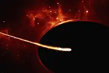 Stephen Hawking described the flight of a fictional astronaut who, passing within a black hole's event horizon, is "stretched like spaghetti" by the gravitational gradient (difference in gravitational force) from head to toe.[2] The reason this happens would be that the gravitational force exerted by the singularity would be much stronger at one end of the body than the other. If one were to fall into a black hole feet first, the gravity at their feet would be much stronger than at their head, causing the person to be vertically stretched. Along with that, the right side of the body will be pulled to the left, and the left side of the body will be pulled to the right, horizontally compressing the person.[3] However, the term spaghettification was established well before this.[4] Spaghettification of a star was imaged for the first time in 2018 by researchers observing a pair of colliding galaxies approximately 150 million light-years from Earth.[5]