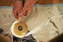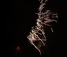 In pyrotechnics, charcoal, iron filings, aluminum, titanium and metal alloys such as magnalium may be used to create sparks.[2] The quantity and style of sparks produced depends on the composition and pyrophoricity of the metal and can be used to identify the type of metal by spark testing. In the case of iron, the presence of carbon is required, as in carbon steel — about 0.7% is best for large sparks. The carbon burns explosively in the hot iron and this produces pretty, branching sparks.[3] The color of sparks used in pyrotechnics is determined by the material that the sparks are made from, with the possibility of adding different chemical compounds to certain materials to further influence the color of the sparks. The basic color of sparks is limited to red/orange, gold (yellow) and silver (white).[2] This is explained by light emission from a solid particle. Light emitted from solid particles is defined by black-body radiation. The temperature of the spark is controlled by the reactivity of the metal. Higher reactive metals lead to hotter sparks. The electronegativity has found to be a helpful indicator to estimate the temperature and consequently the color of a spark.[2] To achieve colors differing from black body emitters, vapor phase combustion of the metal is necessary. A typical example is zinc, with a low boiling of 1180 K. Zinc sparks show an unusual bluish/greenish white appearance.[2] Exotic sparks can be obtained from erbium powder. These sparks switch between surface and vapor phase combustion and accordingly between orange (black body) and green (element specific) emission.[4] The color-change is based on the medium-ranged boiling point of erbium, which burns only partly in the vapor phase.