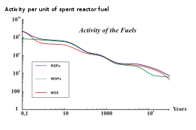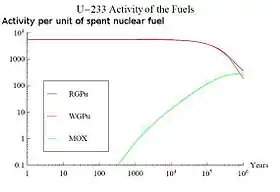 An example of this effect is the use of nuclear fuels with thorium. Th-232 is a fertile material that can undergo a neutron capture reaction and two beta minus decays, resulting in the production of fissile U-233. Its radioactive decay will strongly influence the long-term activity curve of the SNF around a million years. A comparison of the activity associated to U-233 for three different SNF types can be seen in the figure on the top right. The burnt fuels are Thorium with Reactor-Grade Plutonium (RGPu), Thorium with Weapons-Grade Plutonium (WGPu) and Mixed Oxide fuel (MOX, no thorium). For RGPu and WGPu, the initial amount of U-233 and its decay around a million years can be seen. This has an effect in the total activity curve of the three fuel types. The initial absence of U-233 and its daughter products in the MOX fuel results in a lower activity in region 3 of the figure on the bottom right, whereas for RGPu and WGPu the curve is maintained higher due to the presence of U-233 that has not fully decayed. Nuclear reprocessing can remove the actinides from the spent fuel so they can be used or destroyed (see Long-lived fission product#Actinides).