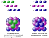 Two simple arrangements within the close-packed family correspond to regular lattices. One is called cubic close packing (or face-centred cubic, "FCC")—where the layers are alternated in the ABCABC... sequence. The other is called hexagonal close packing ("HCP"), where the layers are alternated in the ABAB... sequence. But many layer stacking sequences are possible (ABAC, ABCBA, ABCBAC, etc.), and still generate a close-packed structure. In all of these arrangements each sphere touches 12 neighboring spheres,[2] and the average density is