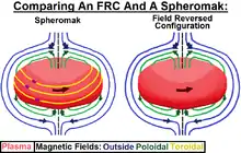 The difference between a field-reversed configuration (FRC) and a spheromak is that a spheromak has an internal toroidal field while the FRC plasma does not. This field can run clockwise or counterclockwise to the spinning plasma direction.[4]