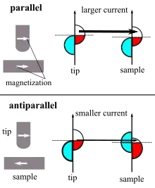 - Nonmagnetic tip with a cluster of magnetic material. In this method voltage pulses are applied between nonmagnetic tip and magnetic sample which causes magnetic material of the sample to attach to the tip. Magnetization direction can be altered by applying further voltage pulses. Alternatively, the tip can be dipped in the magnetic material and then retracted leaving a cluster attached to the tip assuming that the magnetic material properly wets the tip. The tip size is not controlled as in ultrathin film deposition.[7][8]