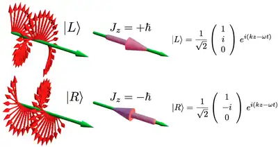 When a light beam is circularly polarized, each of its photons carries a spin angular momentum (SAM) of , where is the reduced Planck constant and the sign is positive for left and negative for right circular polarizations (this is adopting the convention from the point of view of the receiver most commonly used in optics). This SAM is directed along the beam axis (parallel if positive, antiparallel if negative). The above figure shows the instantaneous structure of the electric field of left () and right () circularly polarized light in space. The green arrows indicate the propagation direction.