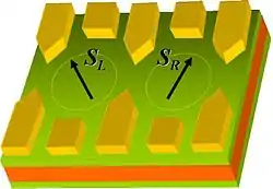 A double quantum dot. Each electron spin SL or SR define one quantum two-level system, or a spin qubit in the Loss-DiVincenzo proposal. A narrow gate between the two dots can modulate the coupling, allowing swap operations.