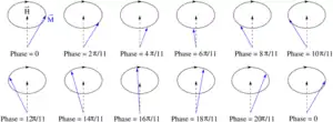 An illustration of the precession of a spin wave with a wavelength that is eleven times the lattice constant about an applied magnetic field.