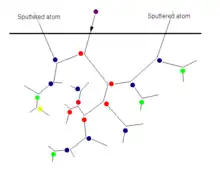 Another mechanism of physical sputtering is called "heat spike sputtering". This can occur when the solid is dense enough, and the incoming ion heavy enough, that collisions occur very close to each other. In this case, the binary collision approximation is no longer valid, and the collisional process should be understood as a many-body process. The dense collisions induce a heat spike (also called thermal spike), which essentially melts a small portion of the crystal. If that portion is close enough to its surface, large numbers of atoms may be ejected, due to liquid flowing to the surface and/or microexplosions.[8] Heat spike sputtering is most important for heavy ions (e.g. Xe or Au or cluster ions) with energies in the keV–MeV range bombarding dense but soft metals with a low melting point (Ag, Au, Pb, etc.). The heat spike sputtering often increases nonlinearly with energy, and can for small cluster ions lead to dramatic sputtering yields per cluster of the order of 10,000.[9] For animations of such a process see "Re: Displacement Cascade 1" in the external links section.