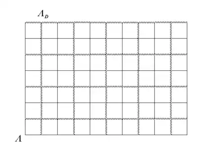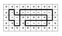 Construct a dual lattice as depicted in the diagram. For every configuration , a polygon is associated to the lattice by drawing a line on the edge of the dual lattice if the spins separated by the edge are unlike. Since by traversing a vertex of the spins need to change an even number of times so that one arrives at the starting point with the same charge, every vertex of the dual lattice is connected to an even number of lines in the configuration, defining a polygon.
