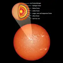 When helium is exhausted at the core of a massive star, the core contracts and the temperature and pressure rises enough to fuse carbon (see Carbon-burning process). This process continues, with the successive stages being fueled by neon (see neon-burning process), oxygen (see oxygen-burning process), and silicon (see silicon-burning process). Near the end of the star's life, fusion continues along a series of onion-layer shells within a massive star. Each shell fuses a different element, with the outermost shell fusing hydrogen; the next shell fusing helium, and so forth.[94]