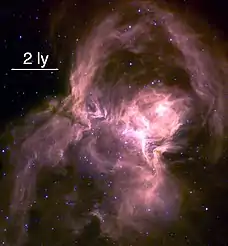 Stars condense from regions of space of higher matter density, yet those regions are less dense than within a vacuum chamber. These regions—known as molecular clouds—consist mostly of hydrogen, with about 23 to 28 percent helium and a few percent heavier elements. One example of such a star-forming region is the Orion Nebula.[56] Most stars form in groups of dozens to hundreds of thousands of stars.[57] Massive stars in these groups may powerfully illuminate those clouds, ionizing the hydrogen, and creating H II regions. Such feedback effects, from star formation, may ultimately disrupt the cloud and prevent further star formation.[58]