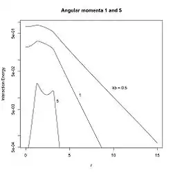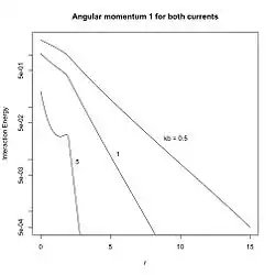 where is the angular momentum quantum number. When we recover the classical situation in which the electron orbits the magnetic field at the Larmor radius. If currents of two angular momentum and interact, and we assume the charge densities are delta functions at radius , then the interaction energy is
