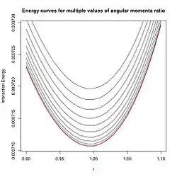 As with delta function charges, the value of in which the energy is a local minimum only depends on the total angular momentum, not on the angular momenta of the individual currents. Also, as with the delta function charges, the energy at the minimum increases as the ratio of angular momenta varies from one. Therefore, the series