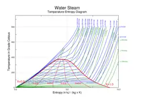 | Enthalpy-entropy (h-s) diagram for steam | Pressure-enthalpy (p-h) diagram for steam | Temperature-entropy (T-s) diagram for steam |