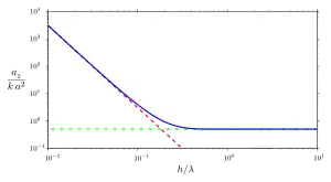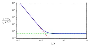 Description: * the blue line is valid for arbitrary water depth, while * the dashed red line is the shallow-water limit (water depth small compared to the wavelength), and * the dash-dot green line is the asymptotic limit for deep water waves.