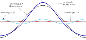 Description: * the dark blue line is the surface elevation of the 3rd-order Stokes wave, * the black line is the fundamental wave component, with wavenumber k (wavelength λ, k = 2π / λ), * the light blue line is the harmonic at 2 k (wavelength 1⁄2 λ), and * the red line is the harmonic at 3 k (wavelength 1⁄3 λ).