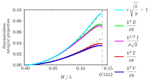 Shown are the kinetic energy density T, the potential energy density V, the total energy density E = T + V, the horizontal wave momentum density I, and the relative enhancement of the phase speed c. Wave energy densities T, V and E are integrated over depth and averaged over one wavelength, so they are energies per unit of horizontal area; the wave momentum density I is similar. The dashed black lines show 1/16 (kH)2 and 1/8 (kH)2, being the values of the integral properties as derived from (linear) Airy wave theory. The maximum wave height occurs for a wave steepness H / λ ≈ 0.1412, above which no periodic surface gravity waves exist.[24]
