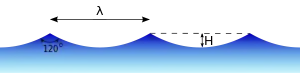The maximum wave steepness, for periodic and propagating deep-water waves, is H / λ = 0.1410633 ± 4 · 10−7,[29] so the wave height is about one-seventh (1/7) of the wavelength λ.[24] And surface gravity waves of this maximum height have a sharp wave crest – with an angle of 120° (in the fluid domain) – also for finite depth, as shown by Stokes in 1880.[18]
