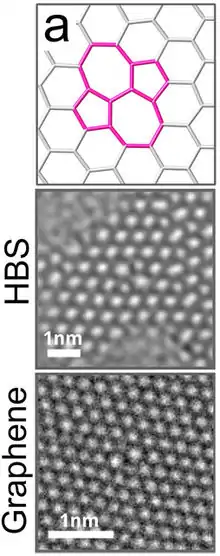 Stone–Wales defect in 2D silica (HBS, middle) and graphene (bottom): model and TEM images.[2]