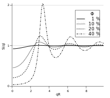 This model has an analytical solution[9] in the Percus–Yevick approximation. Although highly simplified, it provides a good description for systems ranging from liquid metals[10] to colloidal suspensions.[11] In an illustration, the structure factor for a hard-sphere fluid is shown in the Figure, for volume fractions from 1% to 40%.