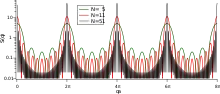 This function is shown in the Figure for different values of . When the scattering from every particle is in phase, which is when the scattering is at a reciprocal lattice point , the sum of the amplitudes must be and so the maxima in intensity are . Taking the above expression for and estimating the limit using, for instance, L'Hôpital's rule) shows that as seen in the Figure. At the midpoint (by direct evaluation) and the peak width decreases like . In the large limit, the peaks become infinitely sharp Dirac delta functions, the reciprocal lattice of the perfect 1-D lattice.