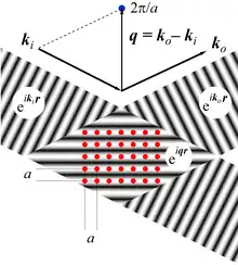 A parallel beam, with wave vector is incident on a square lattice of parameter . The scattered wave is detected at a certain angle, which defines the wave vector of the outgoing beam, (under the assumption of elastic scattering, ). One can equally define the scattering vector and construct the harmonic pattern . In the depicted example, the spacing of this pattern coincides to the distance between particle rows: , so that contributions to the scattering from all particles are in phase (constructive interference). Thus, the total signal in direction is strong, and belongs to the reciprocal lattice. It is easily shown that this configuration fulfills Bragg's law.