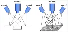 In many practical implementations, series of measurements combining pattern recognition, Gray codes and Fourier transform are obtained for a complete and unambiguous reconstruction of shapes.