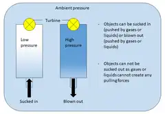 Suction is the day-to-day term for forces experienced by objects that are exposed to the movement of gases or liquids moving along a pressure gradient. Contrary to popular belief, however, the forces acting in this case do not originate from the lower pressure side (the vacuum), but from the side of the higher pressure.