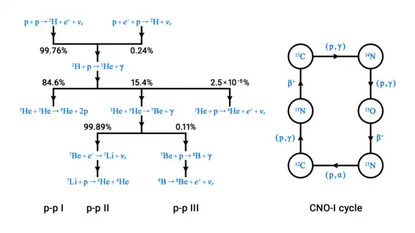 Consequently, stars are a source of neutrinos, including the Sun. These neutrinos primarily come through the p-p chain in lower masses, and for cooler stars, primarily through the CNO cycle of heavier masses.