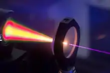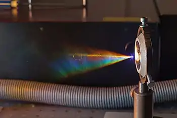 This idea of very short pulses resulting in the broad continuum was studied a year later when Fork et al.[28] reported using 80 fs pulses from a colliding mode-locked laser.[29] The laser's wavelength was 627 nm and they used it to pump a jet of ethylene glycol. They collimated the resulting continuum and measured the pulse duration at different wavelengths, noting that the red part of the continuum was at the front of the pulse and the blue at the rear. They reported very small chirps across the continuum. These observations and others led them to state that self-phase modulation was the dominant effect by some margin. However they also noted that their calculations showed that the continuum remained much larger than self-phase modulation would allow, suggesting that four-wave mixing processes must also be present. They stated that it was much easier to produce a reliable, repeatable continuum using a femtosecond source. Over the ensuing years this source was developed further and used to examine other liquids.[30]