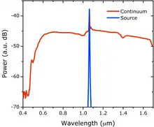 In optics, a supercontinuum is formed when a collection of nonlinear processes act together upon a pump beam in order to cause severe spectral broadening of the original pump beam, for example using a microstructured optical fiber. The result is a smooth spectral continuum (see figure 1 for a typical example). There is no consensus on how much broadening constitutes a supercontinuum; however researchers have published work claiming as little as 60 nm of broadening as a supercontinuum.[1] There is also no agreement on the spectral flatness required to define the bandwidth of the source, with authors using anything from 5 dB to 40 dB or more. In addition the term supercontinuum itself did not gain widespread acceptance until this century, with many authors using alternative phrases to describe their continua during the 1970s, 1980s and 1990s.