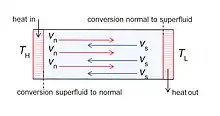 Here ηn is the viscosity of the normal component,[30] Z some geometrical factor, and the volume flow. The normal flow is balanced by a flow of the superfluid component from the cold to the hot end. At the end sections a normal to superfluid conversion takes place and vice versa. So heat is transported, not by heat conduction, but by convection. This kind of heat transport is very effective, so the thermal conductivity of He-II is very much better than the best materials. The situation is comparable with heat pipes where heat is transported via gas–liquid conversion. The high thermal conductivity of He-II is applied for stabilizing superconducting magnets such as in the Large Hadron Collider at CERN.