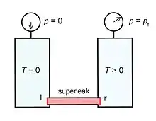 So far Eq.(5) has only mathematical meaning, but in special experimental arrangements pf can show up as a real pressure. Figure 7 shows two vessels both containing He-II. The left vessel is supposed to be at zero kelvins (Tl=0) and zero pressure (pl = 0). The vessels are connected by a so-called superleak. This is a tube, filled with a very fine powder, so the flow of the normal component is blocked. However, the superfluid component can flow through this superleak without any problem (below a critical velocity of about 20 cm/s). In the steady state vs=0 so Eq.(7) implies