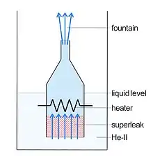 In an experiment, arranged as in figure 8, a fountain can be created. The fountain effect is used to drive the circulation of 3He in dilution refrigerators.[28][29]