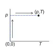 Here Sm is the molar entropy and Vm the molar volume. With Eq.(2) μ(p,T) can be found by a line integration in the p-T plane. First we integrate from the origin (0,0) to (p,0), so at T =0. Next we integrate from (p,0) to (p,T), so with constant pressure (see figure 6). In the first integral dT=0 and in the second dp=0. With Eq.(2) we obtain