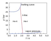 Figure 1 is the phase diagram of 4He.[19] It is a pressure-temperature (p-T) diagram indicating the solid and liquid regions separated by the melting curve (between the liquid and solid state) and the liquid and gas region, separated by the vapor-pressure line. This latter ends in the critical point where the difference between gas and liquid disappears. The diagram shows the remarkable property that 4He is liquid even at absolute zero. 4He is only solid at pressures above 25 bar.