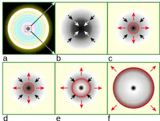 The above processes reduce the core energy and its lepton density. Hence, the electron degeneracy pressure is unable to stabilize the stellar core against the gravitational force, and the star collapses.[15] When the density of the central region of collapse exceeds 1012 g/cm3, the diffusion time of neutrinos exceeds the collapse time. Therefore, the neutrinos became trapped inside the core. When the central region of the core reaches nuclear densities (~ 1014 g/cm3), the nuclear pressure causes the collapse to deaccelerate.[28] This generates a shock wave in the outer core (region of iron core), which triggers the supernova explosion.[15] The trapped electron neutrinos are released in the form of neutrino burst in the first tens of milliseconds.[3][29] It is found from simulations that the neutrino burst and iron photo-disintegration weaken the shock wave within milliseconds of propagation through the iron core.[1] The weakening of the shock wave results in mass infall, which forms a neutron star.[lower-alpha 5] This is known as the accretion phase and lasts between few tens to few hundreds of milliseconds.[3] The high-density region traps neutrinos.[15] When the temperature reaches 10 MeV, thermal photons generate electron–positron pairs. Neutrinos and antineutrinos are created through weak-interaction of electron–positron pairs:[19]