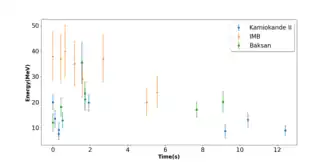 Stirling A. Colgate and Richard H. White,[16] and independently W. David Arnett,[17] identified the role of neutrinos in core collapse, which resulted in the subsequent development of the theory of supernova explosion mechanism.[6] In February 1987, the observation of supernova neutrinos experimentally verified the theoretical relationship between neutrinos and supernovae. The Nobel Prize-winning event,[6] known as SN 1987A, was the collapse of a blue supergiant star Sanduleak -69° 202, in the Large Magellanic Cloud outside our Galaxy, 51 kpc away.[18] About 1058 lightweight weakly-interacting neutrinos were produced, carrying away almost all of the energy of the supernova.[19] Two kiloton-scale water Cherenkov detectors, Kamiokande II and IMB, along with a smaller Baksan Observatory, detected a total of 25 neutrino-events[19] over a period of about 13 seconds.[6] Only electron-type neutrinos were detected because neutrino energies were below the threshold of muon or tau production.[19] The SN 1987A neutrino data, although sparse, confirmed the salient features of the basic supernova model of gravitational collapse and associated neutrino emission.[19] It put strong constraints on neutrino properties such as charge and decay rate.[19][20] The observation is considered a breakthrough in the field of supernovae and neutrino physics.[15]