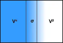 The presence of an interface influences generally all thermodynamic parameters of a system. There are two models that are commonly used to demonstrate interfacial phenomena: the Gibbs ideal interface model and the Guggenheim model. In order to demonstrate the thermodynamics of an interfacial system using the Gibbs model, the system can be divided into three parts: two immiscible liquids with volumes Vα and Vβ and an infinitesimally thin boundary layer known as the Gibbs dividing plane (σ) separating these two volumes.