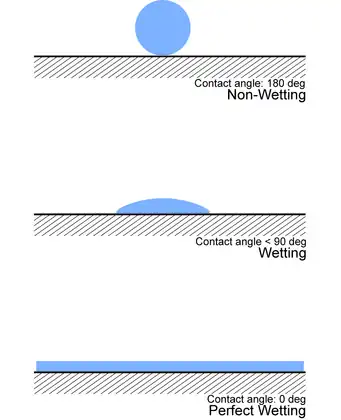 - If θ = 180°, the liquid does not wet the substrate at all.[10]