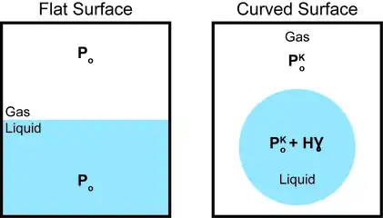 The Kelvin equation is based on thermodynamic principles and is used to describe changes in vapor pressure caused by liquids with curved surfaces. The cause for this change in vapor pressure is the Laplace pressure. The vapor pressure of a drop is higher than that of a planar surface because the increased Laplace pressure causes the molecules to evaporate more easily. Conversely, in liquids surrounding a bubble, the pressure with respect to the inner part of the bubble is reduced, thus making it more difficult for molecules to evaporate. The Kelvin equation can be stated as: