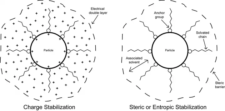 Dispersions may become stable through two different phenomena: charge repulsion and steric or entropic repulsion.[22] In charge repulsion, particles that possess the same like electrostatic charges repel each other. Alternatively, steric or entropic repulsion is a phenomenon used to describe the repelling effect when adsorbed layers of material (such as polymer molecules swollen with solvent) are present on the surface of the pigment particles in dispersion. Only certain portions (anchors) of the polymer molecules are adsorbed, with their corresponding loops and tails extending out into the solution. As the particles approach each other their adsorbed layers become crowded; this provides an effective steric barrier that prevents flocculation.[23] This crowding effect is accompanied by a decrease in entropy, whereby the number of conformations possible for the polymer molecules is reduced in the adsorbed layer. As a result, energy is increased and often gives rise to repulsive forces that aid in keeping the particles separated from each other.