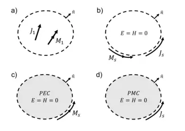 where and correspond to the imaginary current sources that are impressed on the closed surface. and represent the electric and magnetic fields inside the surface, respectively, while and are the fields outside of the surface. Both the original and imaginary currents should produce the same external field distributions.[4]