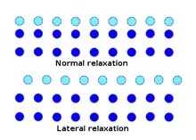 Relaxation refers to a change in the position of surface atoms relative to the bulk positions, while the bulk unit cell is preserved at the surface. Often this is a purely normal relaxation: that is, the surface atoms move in a direction normal to the surface plane, usually resulting in a smaller-than-usual inter-layer spacing. This makes intuitive sense, as a surface layer that experiences no forces from the open region can be expected to contract towards the bulk. Most metals experience this type of relaxation.[1] Some surfaces also experience relaxations in the lateral direction as well as the normal, so that the upper layers become shifted relative to layers further in, in order to minimize the positional energy.