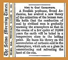 - "We often hear lamentations that the coal stored up in the earth is wasted by the present generation without any thought of the future, and we are terrified by the awful destruction of life and property which has followed the volcanic eruptions of our days. We may find a kind of consolation in the consideration that here, as in every other case, there is good mixed with the evil. By the influence of the increasing percentage of carbonic acid in the atmosphere, we may hope to enjoy ages with more equable and better climates, especially as regards the colder regions of the earth, ages when the earth will bring forth much more abundant crops than at present, for the benefit of rapidly propagating mankind." (p. 63)