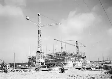 In 1953, after a year of research, meetings and reports alike, the design of the Synchro-Cyclotron started. The construction of the machine began in 1954 on the site at Meyrin with the parts coming from all over Western Europe. In late 1955, Wolfgang Gentner became the director of the Synchro-Cyclotron Study Group, as former director Cornelis Bakker became the Director-General of CERN.[3] The research program for the Synchrocyclotron started to be planned to be able to start experiments as soon as possible.[4] The SC was ready to produce its first beam in August 1957, practically on the date foreseen. A press release by CERN on 16 August 1957, stated that the SC, as the third-largest accelerator of its type in the world, had started to work at its full energy.[5] In late 1958, the Synchrocyclotron made its first important contribution to nuclear physics by the discovery of the rare electron decay of the pion particle. This discovery helped theorists a lot by proving that this decay really occurs.[6] The Synchrocyclotron was used for an average of 135 hours per week during 1961; it ran continuously every day of the week except Mondays which were reserved for maintenance. The Synchrocyclotron was accelerating a jet of protons 54 times a second, up to a speed of approximately 240,000 kilometers per second (80% percent of the speed of light).[7]