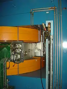 A synchrocyclotron is a special type of cyclotron, patented by Edwin McMillan in 1952, in which the frequency of the driving RF electric field is varied to compensate for relativistic effects as the particles' velocity begins to approach the speed of light. This is in contrast to the classical cyclotron, where this frequency is constant.[1]