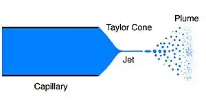 A Taylor cone refers to the cone observed in electrospinning, electrospraying and hydrodynamic spray processes from which a jet of charged particles emanates above a threshold voltage. Aside from electrospray ionization in mass spectrometry, the Taylor cone is important in field-emission electric propulsion (FEEP) and colloid thrusters used in fine control and high efficiency (low power) thrust of spacecraft.