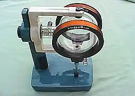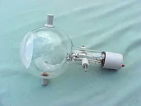 A teltron tube (named for Teltron Inc., which is now owned by 3B Scientific Ltd.) is a type of cathode ray tube used to demonstrate the properties of electrons. There were several different types made by Teltron including a diode, a triode, a Maltese Cross tube, a simple deflection tube with a fluorescent screen, and one which could be used to measure the charge-to-mass ratio of an electron.[1] The latter two contained an electron gun with deflecting plates. The beams can be bent by applying voltages to various electrodes in the tube or by holding a magnet close by. The electron beams are visible as fine bluish lines. This is accomplished by filling the tube with low pressure helium (He) or Hydrogen (H2) gas. A few of the electrons in the beam collide with the helium atoms, causing them to fluoresce and emit light.