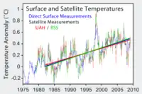 Satellite temperature measurements are inferences of the temperature of the atmosphere at various altitudes as well as sea and land surface temperatures obtained from radiometric measurements by satellites. These measurements can be used to locate weather fronts, monitor the El Niño-Southern Oscillation, determine the strength of tropical cyclones, study urban heat islands and monitor the global climate. Wildfires, volcanos, and industrial hot spots can also be found via thermal imaging from weather satellites.